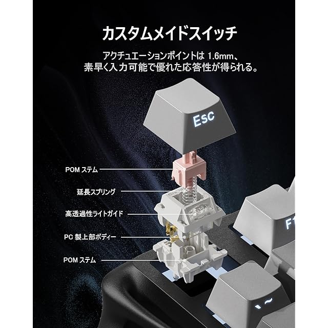 【カスタムメイドスイッチ】「BSUN」メーカーと一緒に開発された「Cherry Pink」リニアスイッチ、アクチュエーションポイントは1.6mm、素早く入力可能で優れた応答性が得られる。7000 万回のキーストロークの動作寿命、長く使い続けられる。40G軽い押下圧、ソフトタッチで入力できるため、長時間使用しても疲れにくいです。