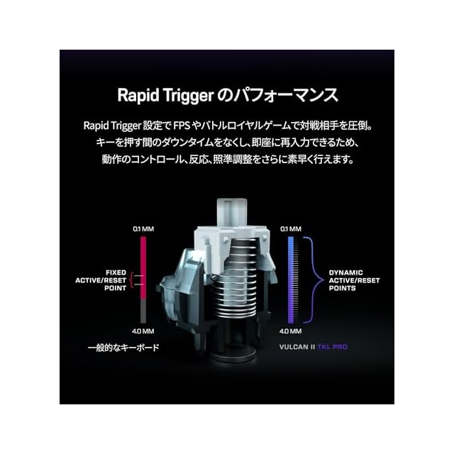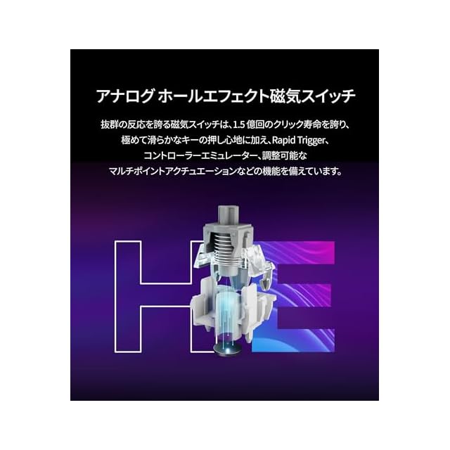 【ストッピングで差をつけよう】 抜群の反応を誇るマグネットスイッチは潤滑済みで、クリック寿命は1.5 億回と定格されており、極めて滑らかなキーの押し心地に加え、FPSにおけるストッピングに有効なラピッドトリガーやリアクタップ(SOCDクリーナー機能)、調整可能なマルチポイントアクチュエーションなどの機能を備えています。
