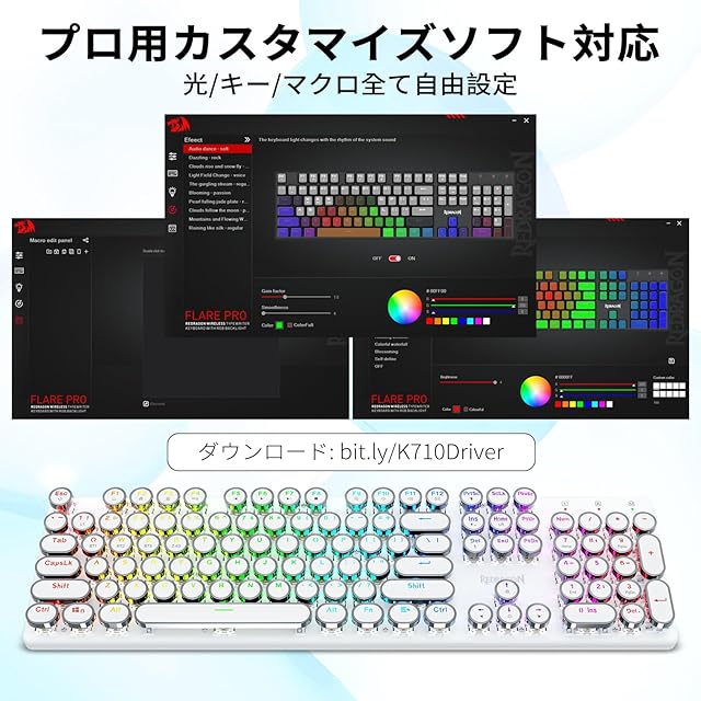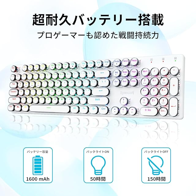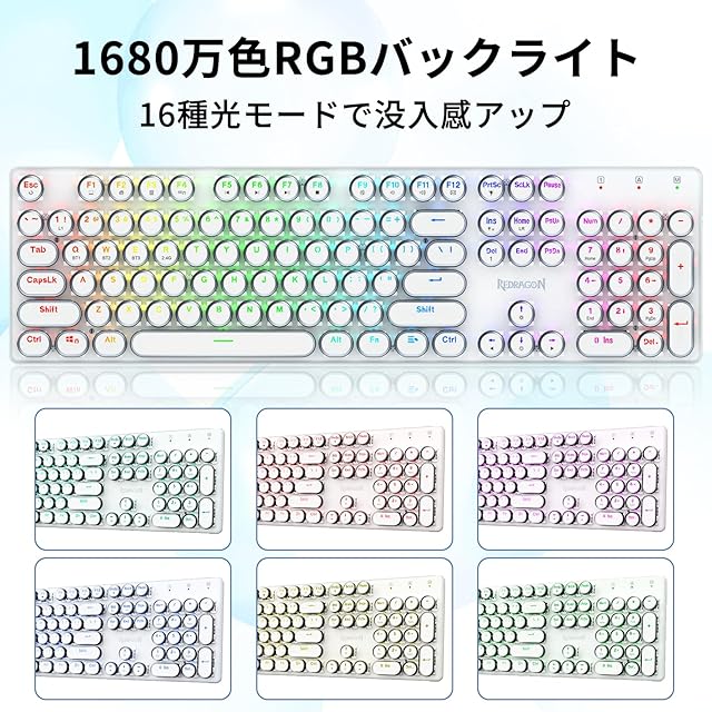 商品名:Redragon K710 メカニカルキーボード ワイヤレス/有線 青軸 クリッキー タイプライター風 レトロデザイン 【Bluetooth/2.4GHz/USB-C】 英語配列 テンキー付き 104キー RGBバックライト 充電式 ゲーミングキーボード 北欧風 ミニマル (ホワイト)