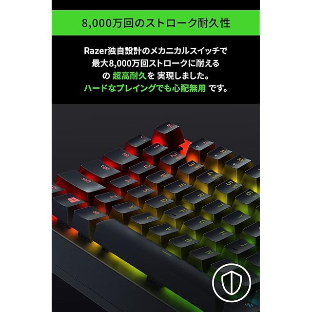 【8,000 万回のキーストローク】 このテンキーレスメカニカルゲーミングキーボードのスイッチは、長年に渡るゲームプレイにも耐える設計になっており、競技で活躍する高い信頼性が得られます。