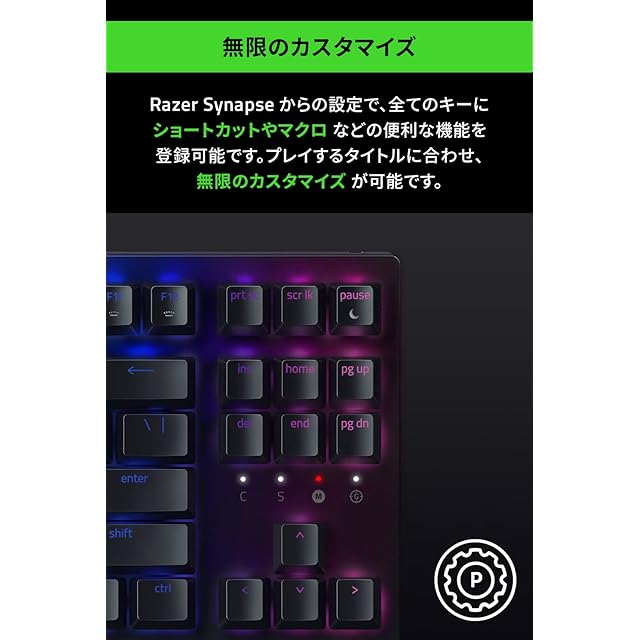 【RAZER イエローメカニカルスイッチ】 RAZER イエローメカニカルスイッチの静音リニアスイッチは、タクタイルバンプのない非常に滑らかなキーストロークを実現し、音を抑える仕様によりさらに静音性を強化しています。