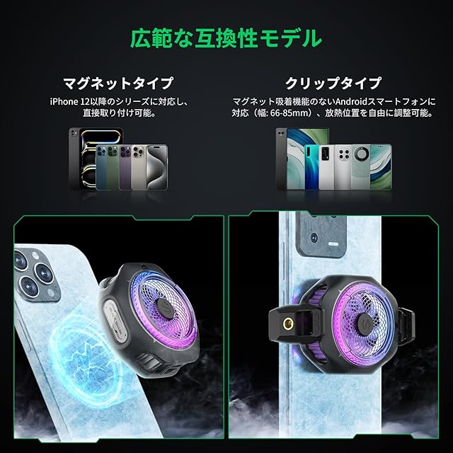 【広範な互換性】取り外し可能なグリップが付属し、超強力な12Nの磁力と組み合わせることで、磁気吸着およびスマホショルダーの両方の使用が可能です。磁気吸着式スマホ散熱器の互換性の問題から解放され、Androidスマートフォン/iPhone/Switch/iPad/ノートパソコンなど、広範な機種に対応しています。さらに、銅製ナットデザインを追加し、さまざまなシーンでの使用が可能になりました。