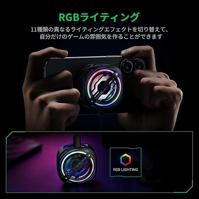 【超静音スマホ 冷却ファン】スマホクーラーには11色のRGBカラーとさまざまなライティング効果があり、シーンに応じて異なるカラー効果を選択して独自の雰囲気を作り出すことができます。低騒音設計でゲームや動画視聴などをより快適にできます。冷却ファンは運転音が小さいので、通話や生放送をする際にもおすすめです。