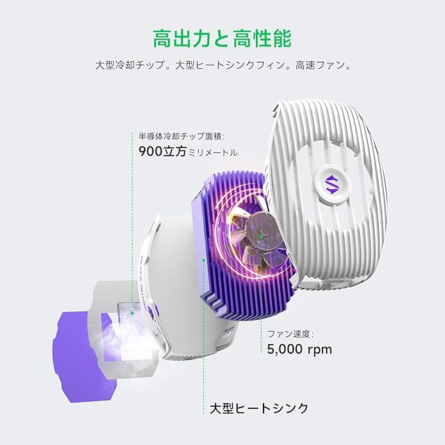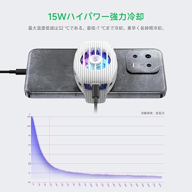 【15Wパワー超高速冷却】高性能ペルチェ素子(TEC) を採用したスマホクーラー、本体温度を約32℃温度を下げる放熱能力。大きな接触面と、ささやくような静かな7枚のファンで瞬時の冷却を実現しています。 注:使用には電源への接続が必要。データケーブルはパッケージに含まれていません。