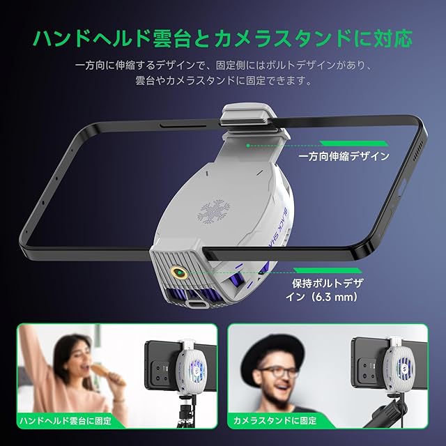 【ユニバーサル対応】 クーラーは一方向に伸びるデザイン。 あらゆるサイズのAndroidおよびiPhoneスマートフォンに取り付け可能で(幅68~85mmのデバイスに対応)、AndroidとiOSの両方に対応しています。固定側はボルトデザイン。 携帯電話をクランプしたラジエーターをハンドヘルド雲台やカメラマウントに取り付けることができる。