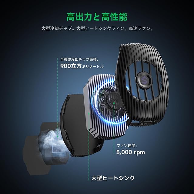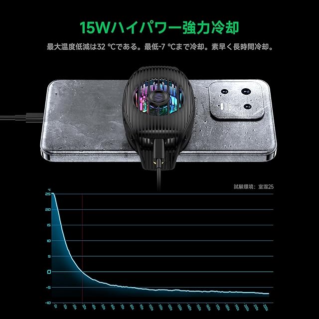 【15Wパワー超高速冷却】高性能ペルチェ素子(TEC) を採用したスマホクーラー、本体温度を約32℃温度を下げる放熱能力。大きな接触面と、ささやくような静かな7枚のファンで瞬時の冷却を実現しています。 注:使用には電源への接続が必要。データケーブルはパッケージに含まれていません。