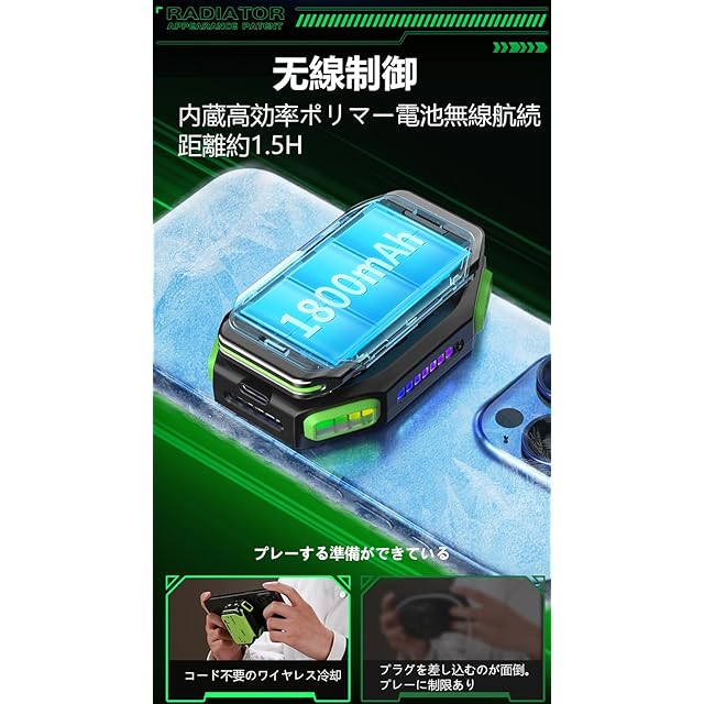 【バッテリー付き・ワイヤレス/有線2WAY切り替え可能】1800mAhの大容量リチウム電池、充電しながらゲーム・音楽・映画などお楽しみ頂けます。充電式なので場所を選ばずケーブル不要で利用できます。オフィスや外出時に大活躍!充電時間:約90分。稼働時間:約90分。スマホ冷却ファン