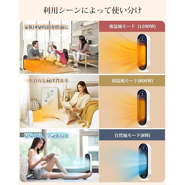 【自動首振りでより広範囲を暖める縦型電気ファンヒーター】自動首振り機能を備えており、本体を移動させなくても広範囲をしっかり暖め、家族団欒の席でも全員に温風を届けてくれます。また、電気ヒーターの高さが約50cmある縦長の送風口なので椅子に座った状態でも膝元や足元でも全身暖まることができます。スタンド型スリムタイプで場所も取らず、脱衣室などの狭いスペースでも余裕で設置できてあちこちに簡単に移動して使えていいですばやく効率的に充満させ、タワー型暖房器具 省エネ寒い季節に暖かさで包み込まれます!