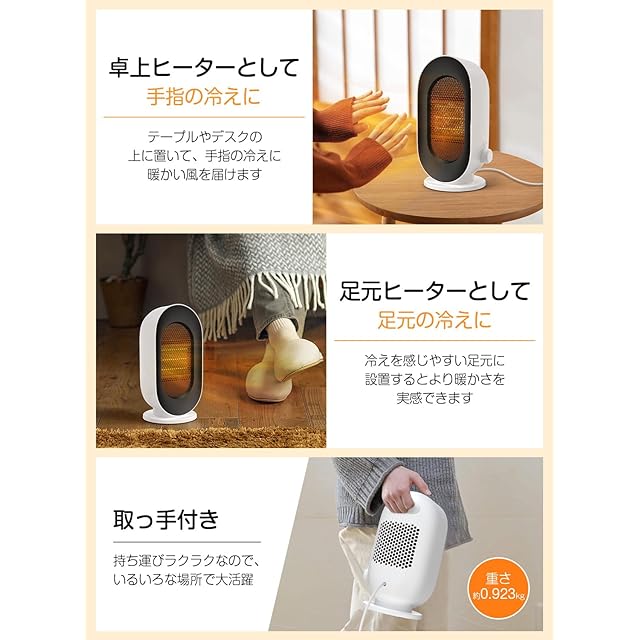 【転倒オフ安全設計・持ち運び楽々】卓上に設置できるコンパクトで使いやすい、おしゃれな小型ファンヒーターです。約0.923kgの超軽量なので、デスク上など限られたスペースに設置しやすくデスクワークや手元や足元に置いて使いたい方におすすめです。取っ手付きで手軽に持ち運びできで、使う場所を変えたい時や、お掃除の際も簡単に移動できます。ボディはV0級難燃安全素材を採用。足元設置に嬉しい「転倒時自動停止機能」や「過熱防止機能」を搭載、思わず蹴っ飛ばしたっり、不意の衝撃や地震などで転倒したりしまった時や温度が上がり過ぎた時に自動で電源がオフになり、安全性とデザイン性を兼備した逸品です。