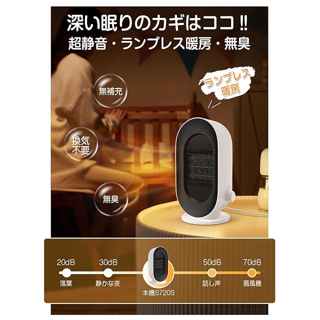 【深い眠りのカギはココ! 静音発熱・最新ランプレス発熱設計】冬の夜、布団に入って眠ろうとすると、 電気ヒーターの赤外線が強すぎて眠れない?LAOGOTの電気ファンヒーターなら、2024最新ランプレス発熱技術を採用しますので、夜に無灯火で加熱できるので、睡眠時に眩しくなくて、ぐっすり眠れます。そして、運転音は最大約38dBなので、静音性に優れており、勉強や仕事などに集中したい場合でも、動作音を気にすることなく使用できるのが嬉しいポイントです。電源ボタンはレトロなダイヤル式で、回すだけで作動する暖房器具なので、最近のタッチで作動するヒーターの使い方がわかりにくいお年寄りにやさしいです。