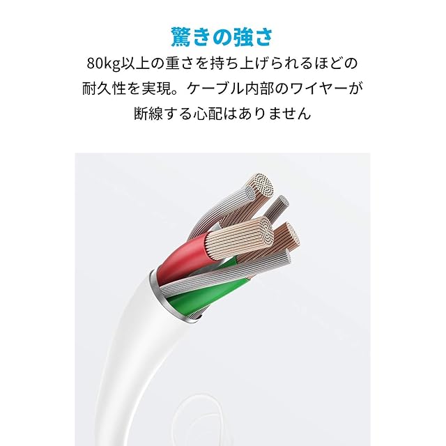 数が示すその強さ:一般的なケーブルより12倍以上の耐久性をもち、12000回以上の厳しい折り曲げテストもクリアしました。また、約80kg以上の重さを持ち上げられるほどに耐久性を実現。ケーブル内部のワイヤーを断線から保護し、安心して充電することができます。