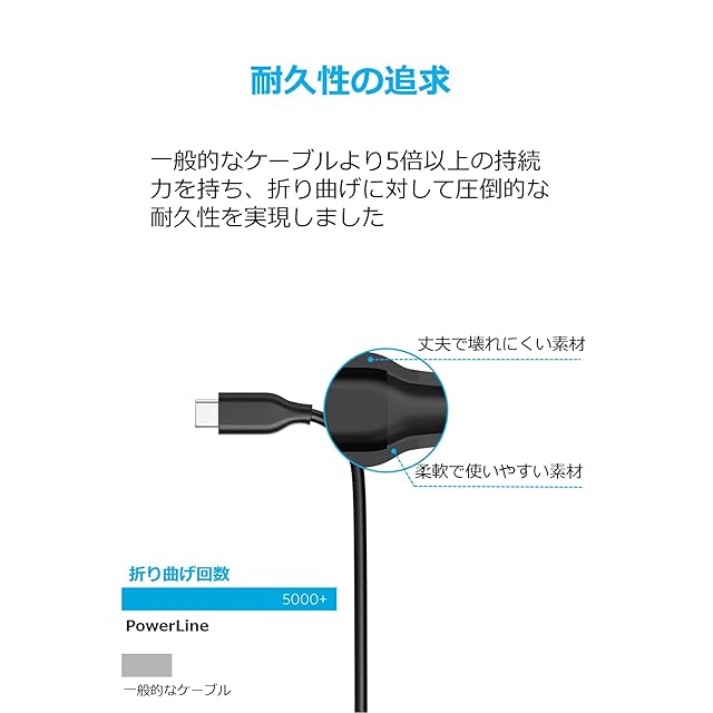 Anker PowerLine USB-C & USB 3.0<br> 高耐久のデータ転送ケーブル<br><br> Anker:全米No.1 USB充電ブランド<br> - 最先端技術による高速かつ安全な充電<br> - 3000万人以上が支持する信頼の品質<br><br> バックアップ充電<br>バックアップ充電 モバイルバッテリーやUSB充電器から、iPad Pro (2018, 11インチ) / MacBook / MacBook Air (2018) やChromeBook Pixelやその他のUSB-C対応機器へ充電することができます。<br><br> 超高速同期<br> USB-C対応機器に対し、双方向で5Gbpsのハイスピードでデータの転送が可能です。<br><br> 両面使用可能<br> USB-Cは使いやすさを追及したデザインで、いつでも正しくケーブルを挿入できます。<br><br> 向上した耐久性:<br> PowerLineは、高耐久素材を内部に採用し、一般的なケーブルより5倍以上長持ちします。<br><br> 世界でも名高い製品 <br> Ankerは弊社製品に絶対の自信を持っています。そのため、18ヶ月と品質の高いカスタマーサポートを全ての製品に提供しています。<br><br> 対応機種(急速充電対応)<br> - Galaxy S10 / S10+ / S9 / S9+ / S8 / S8+<br> - HTC 10<br> -Xperia XZ<br> - LG V20 / G5 / G6<br> - Xiaomi 5<br><br> 対応機種(急速充電 非対応) <br>- Nexus 5X / 6P<br> - MacBook / MacBook Pro (13インチ、15インチ) / iPad Pro (2018, 11インチ) / MacBook Air (2018)<br> - Google Chromebook / Pixel C<br> - Google Pixel/Pixel XL<br> - Huawei Mate 9/P10<br> - MOTO Z/Z Force<br> - One Plus 3<br><br> ご注意: <br> もしお使いの機器が本ケーブルと互換性があるかどうか不明な場合は、弊社カスタマーサポートへご連絡ください。