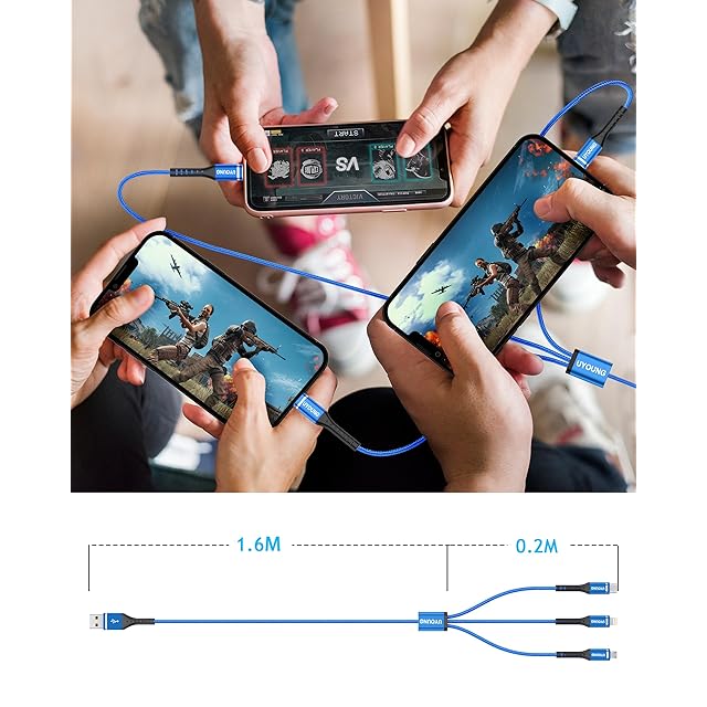 1つのUSBポートから3台のデバイスが同時に充電できます。<br> もしあなたの家に異なるタイプの携帯電話があれば、多くのケーブルは必要ありません。デスク、リビング、寝室、車など、どんな場合でも使用できます。<br><br> ▼名前:UYOUNG 3in1 USB ケーブル<br> ▼特徴:3in1 <br> ▼素材:アルミニウム合金+ナイロン編み <br> ▼長さ:180 cm <br> ▼端子:Type-C、ライトニング、Micro USB<br><br> 一本のケーブルで3つのデバイスを同時に充電できるし、3種類の端子(ライトニングiOS・Type-C・Micro USB)を搭載しており。市場ほとんどな機種に対応できます。 <br> 強靭なナイロン編み、高質感アルミ合金外装を採用しており、ケーブルの高い耐久性を実現しました。<br><br> ご注意 :<br> Lightningコネクタ(iOSモデル)のみがデータ転送をサポートできます。<br> Type-CインターフェースとMicro USBインターフェースは充電のみをサポートし、データ転送を対応しません。