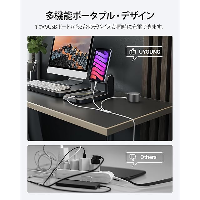 【3台同時充電 】1つのUSBポートから3台のデバイスが同時に充電できます。ライトニングデバイス、Type-C機器、マイクロUSB機器を対応し、3台接続機器へ同時に急速充電を対応します、充電スピードも早くて 本当に便利です。