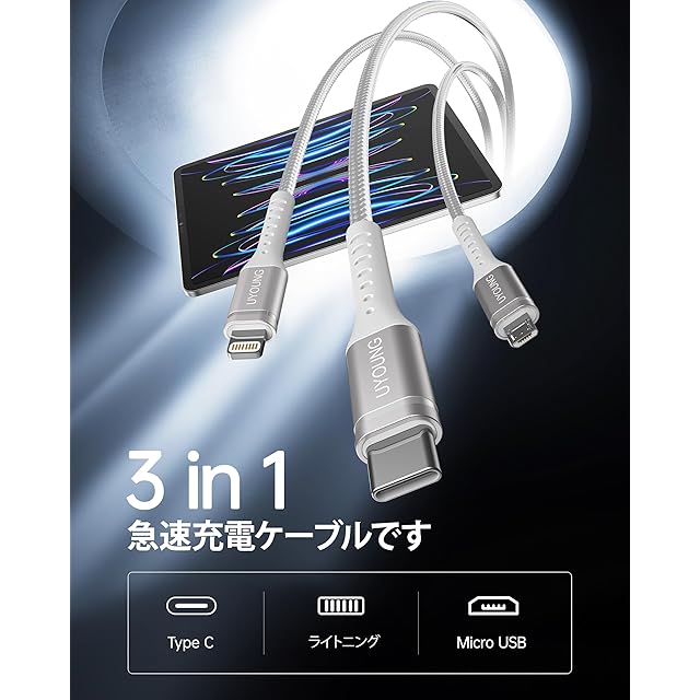 【3in1 充電ケーブル】本製品は三合一充電線、マルチヘッド充電線です。3種類の端子(ライトニングiOS・Type-C・Micro USB)を搭載しており、自宅、オフィス、車内等色々な場所で、1本だけを持つと十分。 【3台同時充電 】1つのUSBポートから3台のデバイスが同時に充電できます。ライトニングデバイス、Type-C機器、マイクロUSB機器を対応し、3台接続機器へ同時に急速充電を対応します、充電スピードも早くて 本当に便利です。 【高耐久ナイロン&断線防止設計】柔軟性と耐久性を兼ね備えた二重編込高耐久ナイロン素材を採用、iPhone充電ケーブルがより頑丈で柔軟になります。根元強化デザイン、10000回以上の折り曲げテスト、普通のケーブルより長い使用可能です。 【対応機種・幅広い互換性】3in1 多機能ケーブルはほぼ全設備にphone対応できます。ライトニング端子・Type C端子やMicro USB端子搭載のスマホ・タブレット・イヤホン等のUSB周辺機器を対応します。 【安心サポート】:購入後12ヶ月の期間があり、24時間以内にソリューションを提供します。