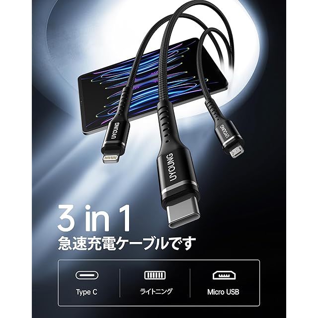 【3in1 充電ケーブル】本製品は三合一充電線、マルチヘッド充電線です。3種類の端子(ライトニングiOS・Type-C・Micro USB)を搭載しており、自宅、オフィス、車内等色々な場所で、1本だけを持つと十分。