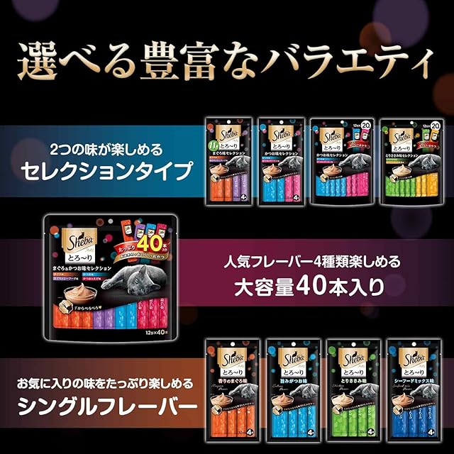 猫ちゃんが手からでも舐めやすい、贅沢なおいしさの“とろ~り”おやつ。人気の4種をたっぷり入れたセレクションの大容量タイプ。