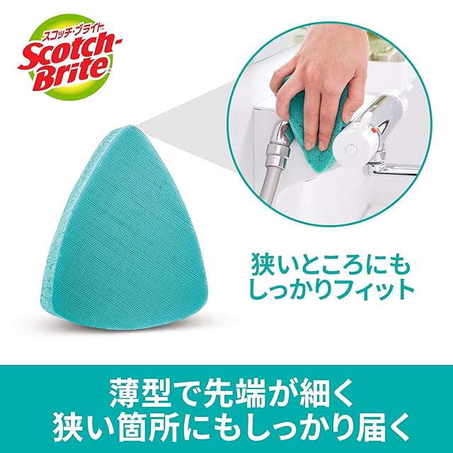 【狭いすき間もお任せ!薄型で細かい箇所もキレイに】 先端が細い三角スポンジ。手のひらサイズで扱いやすく、狭いところにもしっかりフィットし、隙間や蛇口まわりの細かいところもしっかりお掃除できます。