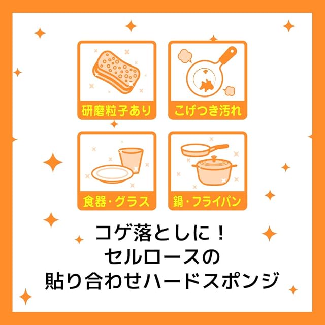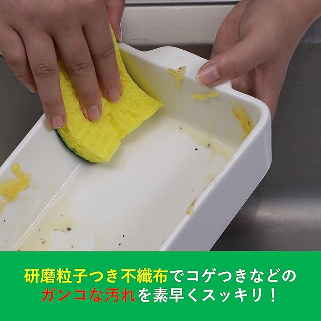 【ガンコな汚れをスッキリ落とすスポンジたわし】セルローススポンジと研磨粒子付きポリエステル不織布を貼り合わせたスポンジたわしで、鍋やフライパンなどの調理器具の頑固な汚れやコゲを素早くしっかり落とします。短時間で汚れを落とせるので、時間の節約につながります。