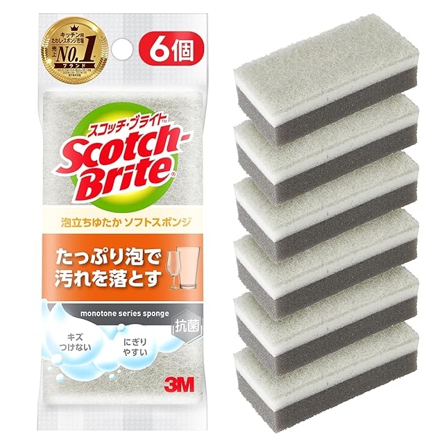 【.co.jp限定】 3M スコッチブライト 泡立ちゆたか ソフト スポンジ 食器洗い キッチンスポンジ 食器用スポンジ キズつけない グレー 6個