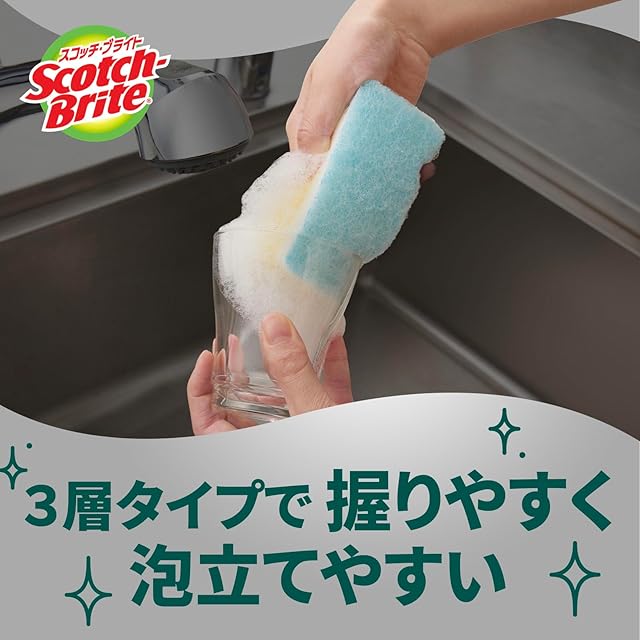 【泡立ち抜群で、食器洗いが楽しくなる! 】握りやすくコシのある2種類のウレタンスポンジをバランスよく貼り合わせることで、少ない洗剤でもたっぷり泡が立ち、油汚れや軽い汚れをキレイに落とします。