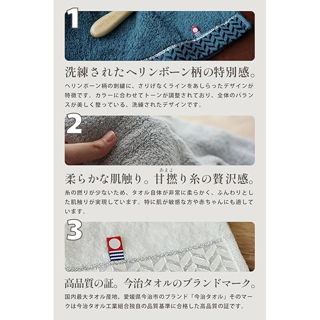 【 高級感のあるボリュームと吸水力の今治タオル 】高級ロングパイル甘撚り撚糸を使用。ヘムに配したシンプルなヘリンボーンパターンは、スリット糸とレーヨン糸を組み合わせる事で、上品な見た目と高級感に仕上げられています。
