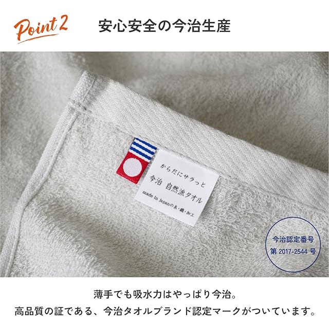 今治産タオル自然派タオルは40番手という細い糸を使用した、からだに馴染みやすい薄手の日常向けのタオル。 毛羽落ちが少なく柔らかさがからだに馴染む、そんな感覚が楽しめます。 細い糸を紡ぐことは日本の技術が必要です。 今治タオルブランドの品質を保ちながら「うすい」のにお風呂上がりや洗顔後の水分をしっかり吸水。 毎日の生活を共に過ごす、快適な今治タオルの誕生です。 価格も一般的な今治タオルと比べ安いので気兼ねなく使えます。 今治の職人による匠の技。国産ならではの肌触りの良さと使いやすい薄手の新感覚タオル。 それが「今治自然派タオル」です。 ベビーにも安心の自然派タオル。 からだへのやさしさ、自然を感じてください。