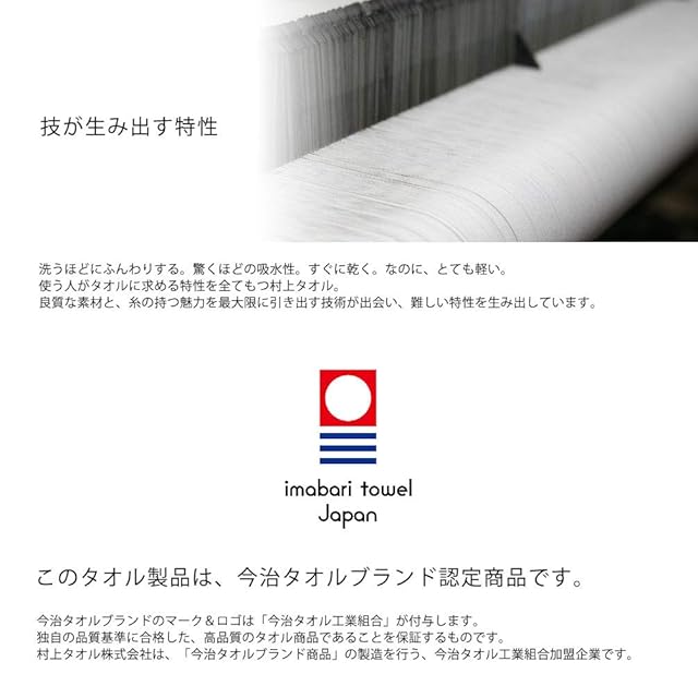 このフェイスタオルは、今治タオル(imabari towel)に認定されたフェイスタオルです。今治タオルのブランドマーク&ロゴは「今治タオル工業組合」が付与します。独自の認定基準に合格した、最高品質のフェイスタオルであることをするものです。認定番号 第2013-734号 企業番号0055 村上タオル(株)