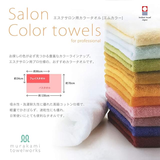 <p>【エムカラー 全100色】<br />エステサロンや医療機関用に、豊富なカラーバリエーションで作られた、やや薄手のフェイスタオルです。綿100%のやわらかな生地で吸水性がよく、日常の生活で扱いやすいタオルです。部屋干しにも適した速乾性の高いタオルですので、スポーツ・レジャーシーンをはじめ、アウトドアや旅行のお供にも最適です。また軽量薄手のタオルですので、お風呂上りに頭に巻いたり様々な使い方ができます。</p><p>【水を吸う 何度も洗う すばやく乾き、かさばらない】<br />くりかえし何度も使われる業務用タオル。現場のプロの声を集めて開発された村上タオルの「エムカラー」は、過酷な環境にも耐える高耐久性タオルです。</p><p>【信頼の今治ブランド】<br />11項目の厳しい検査基準がある今治タオル。「エムカラー」は全ての項目をクリアした高品質なタオルとして認定を受けています。また、良質な天然水で丁寧に晒すことでしなやかな柔らかさと肌触りを実現しました。</p><p>【豊富なカラーバリエーション】<br />創業から100年、ホテル・旅館や医療機関、エステサロンなどの様々な業種にお愛顧いただいてきた業務用タオル。店内設備やコーポレートカラーに合わせた、様々なカラーをご用意致しました。</p><p>【プロ用のエステタオル】<br />プロのニーズに合った業務用タオルを・・。長年開発してきた、実用性を最優先とする業務用タオルの最高峰が「エムカラー」。リーズナブルな価格でありながら日常使いとしても、とても便利なタオルです。</p><p>【キッチンのお手拭きタオルに】<br />ご家庭のキッチンのタオルには、場所を取らないコンパクトなタオルが一番。さっと手を一拭き、優れた吸水性と、コストパフォーマンスにも優れた、「エムカラー」をおすすめします。</p><p>【アウトドアキャンプに】<br />アウトドアキャンプの必須品であるタオル。荷物がかさばらないよう、コンパクトでしかも吸水性が優れたタオルがいいですね。「エムカラー」は薄手でとても軽量、持ち運びも便利でカラーも豊富、キャンプのお供に最適なタオルです。</p>