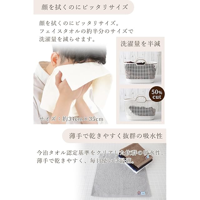 顔を拭くのにピッタリサイズで、フェイスタオルの約半分のサイズで洗濯量を減らせます。