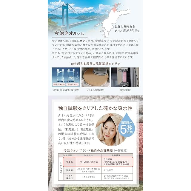 【商品説明】安心・安全・高品質の、今治タオルブランド認定済フェイスタオル。吸水性・脱毛率・パイル保持率・染色堅牢度・引っ張り強さ・ホルムアルデヒド残留量など、独自の品質基準をクリアしたタオルです。エステサロンから一般のご家庭でのご利用にもどうぞ。
