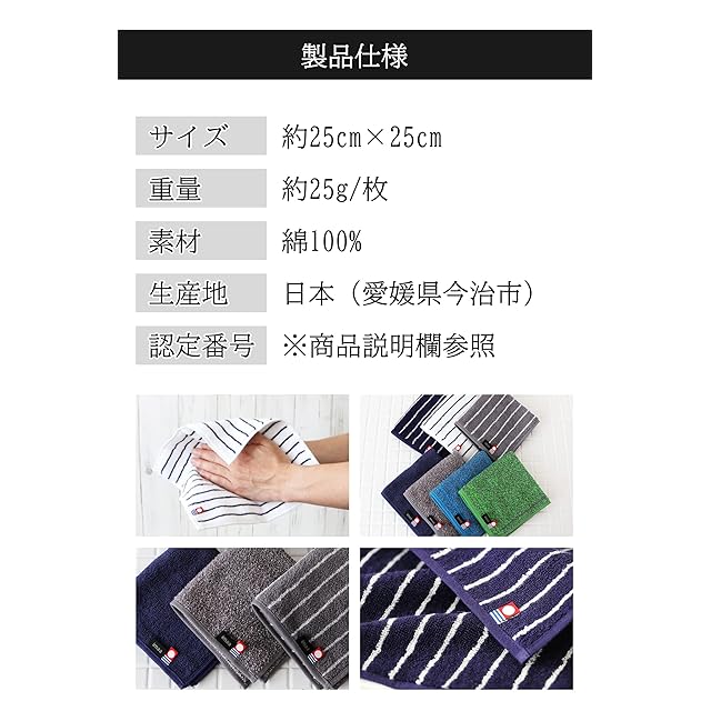サイズ:約25cm×25cm 重量:約25g/枚 デザイン(認定番号):ネイビー(第2021-1129号)、ホワイト(第2022-1032号)、ミックスグレー(第2021-918号)、ピンストライプグレー(第2021-917号)、リバーシブルネイビー(第2022-1326号)、ブルー・グリーン(第2022-1325号)、しましまネイビー・しましまグレー(第2022-2634号)、テールグリーン・ブラック(第2023-2689号)、無地Aアソート4枚(第2021-945号) 素材:綿100% 生産地:日本(愛媛県今治市) ※モニターの発色の具合により実際のものと色が異なる場合がございます。 ※清潔でコンパクトな圧縮パックでお届けいたします。開封してしばらくすると空気を含み、元の状態に戻ります。配送状態により元に戻っている場合がございます。