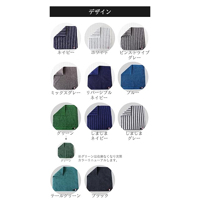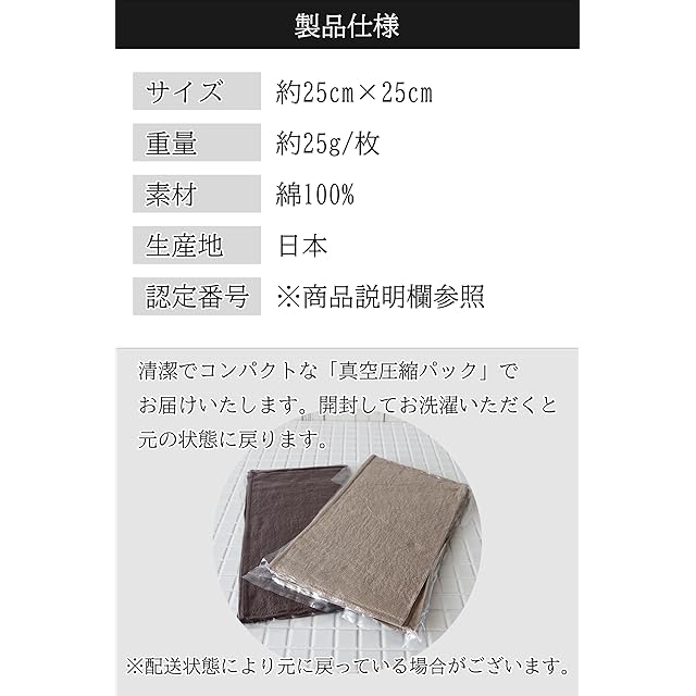 サイズ:約25cm×25cm 重量:約25g/枚 デザイン(認定番号):ネイビー(第2021-1129号)、ホワイト(第2022-1032号)、ミックスグレー(第2021-918号)、ピンストライプグレー(第2021-917号)、リバーシブルネイビー(第2022-1326号)、ブルー・グリーン(第2022-1325号)、しましまネイビー・しましまグレー(第2022-2634号)、テールグリーン・ブラック(第2023-2689号)、無地Aアソート4枚(第2021-945号) 素材:綿100% 生産地:日本(愛媛県今治市) ※モニターの発色の具合により実際のものと色が異なる場合がございます。 ※清潔でコンパクトな圧縮パックでお届けいたします。開封してしばらくすると空気を含み、元の状態に戻ります。配送状態により元に戻っている場合がございます。