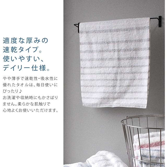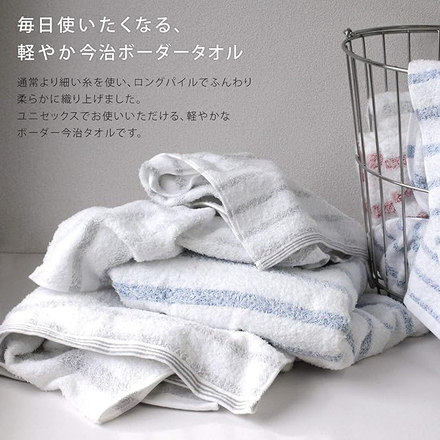 高品質の証、今治タオル認定。<br>通常のタオルより細番手の上質糸を使用し、ロングパイルに仕上げています。<br>厳選した細い糸を使うことで、軽やかなボリュームと、肌馴染みの良い繊細な柔らかさが生まれ、さらに毛羽落ちが軽減されます。<br>毎日使いやすくするため、やや薄手に織り上げています。<br>それでも吸水性は今治タオルの厳しい検査基準をクリア。しっかり吸水してくれます。<br>白いパイルの間からほんのりと霧がかって見えるやさしいボーダーラインが軽やかで、心地よくお使いいただけます。<br><br>【お洗濯のご注意】<br>お買いになられたタオルは一度、お洗濯をされてからお使いください。<br>初めのうちは毛羽落ちしやすいため、単独でのお洗濯をおすすめします。<br>乾燥機のご使用は、タオルへの負荷がかかり、痛みを促進してしまう恐れがあります。その結果、毛羽落ちも多くなってしまうことに繋がります。<br>毛羽落ちを軽減して長くご愛用して頂くためにはお日様で干し、柔軟剤は毛羽落ちが治まってから、標準量を守ってお使いくださいますことをおすすめいたします。<br><br>【ドラム式洗濯機の注意】<br>ドラム式洗濯機をご使用の場合、タオルの風合いが悪くなったり、毛羽落ちしやすくなる場合があります。<br>ご使用のドラム式洗濯機取扱説明書をご確認の上、お洗濯ください。<br>