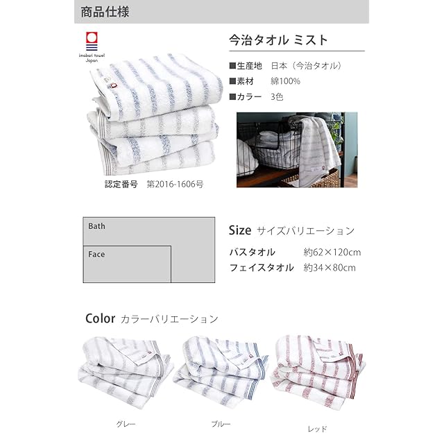 高品質の証、今治タオル認定。<br>通常のタオルより細番手の上質糸を使用し、ロングパイルに仕上げています。<br>厳選した細い糸を使うことで、軽やかなボリュームと、肌馴染みの良い繊細な柔らかさが生まれ、さらに毛羽落ちが軽減されます。<br>毎日使いやすくするため、やや薄手に織り上げています。<br>それでも吸水性は今治タオルの厳しい検査基準をクリア。しっかり吸水してくれます。<br>白いパイルの間からほんのりと霧がかって見えるやさしいボーダーラインが軽やかで、心地よくお使いいただけます。<br><br>【お洗濯のご注意】<br>お買いになられたタオルは一度、お洗濯をされてからお使いください。<br>初めのうちは毛羽落ちしやすいため、単独でのお洗濯をおすすめします。<br>乾燥機のご使用は、タオルへの負荷がかかり、痛みを促進してしまう恐れがあります。その結果、毛羽落ちも多くなってしまうことに繋がります。<br>毛羽落ちを軽減して長くご愛用して頂くためにはお日様で干し、柔軟剤は毛羽落ちが治まってから、標準量を守ってお使いくださいますことをおすすめいたします。<br><br>【ドラム式洗濯機の注意】<br>ドラム式洗濯機をご使用の場合、タオルの風合いが悪くなったり、毛羽落ちしやすくなる場合があります。<br>ご使用のドラム式洗濯機取扱説明書をご確認の上、お洗濯ください。<br>