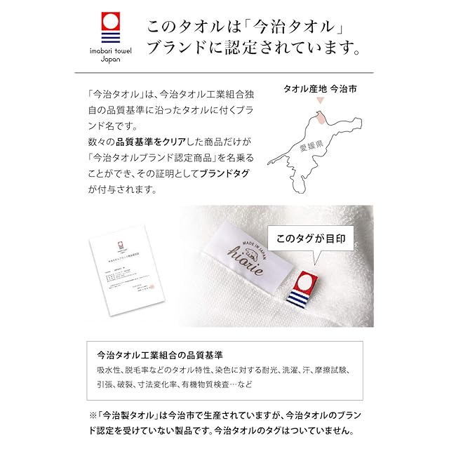 【高品質の証 今治タオル認定】日本を代表するタオル産地今治は、主にギフト向けの高級感のある厚手のタオルや、織り柄をあしらったタオルなどを得意とする産地です。この今治タオルブランドマークは、今治のメーカーをまとめる「今治タオル工業組合」独自の品質基準に合格した高品質のタオル商品であることをするものです。