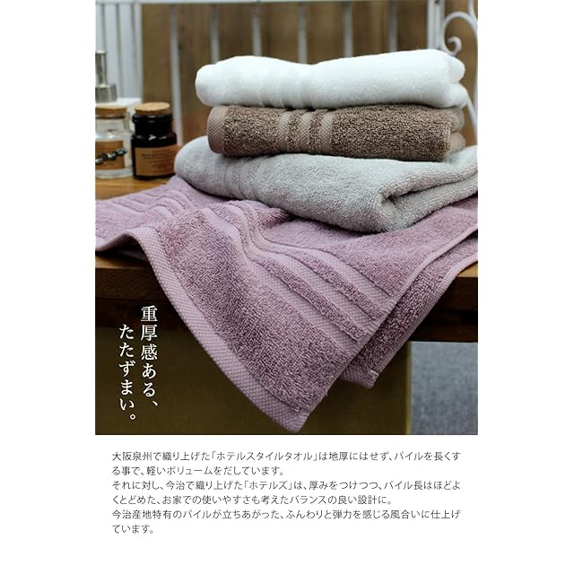 高品質の証、今治タオル認定。<br>ホテルみたいな心地よさをお家で。そんな想いから生まれた今治発のホテルスタイルタオルです。<br>パイルが立ち上がったふんわりと弾力を感じる風合いに仕上げています。<br>厚みをつけつつ、パイル長はほどよくとどめた、お家での使いやすさも考えたバランスのいい設計に。<br>ボリュームのあるバスタオルから、お風呂上りに使いやすいミニバスタオル、通常サイズのフェイスタオル、コンパクトなハンカチタオルの4アイテムをご用意。<br><br>【お洗濯のご注意】<br>お買いになられたタオルは一度、お洗濯をされてからお使いください。<br>初めのうちは毛羽落ちしやすいため、単独でのお洗濯をおすすめします。<br>乾燥機のご使用は、タオルへの負荷がかかり、痛みを促進してしまう恐れがあります。その結果、毛羽落ちも多くなってしまうことに繋がります。<br>毛羽落ちを軽減して長くご愛用して頂くためにはお日様で干し、柔軟剤は毛羽落ちが治まってから、標準量を守ってお使いくださいますことをおすすめいたします。<br><br>【ドラム式洗濯機の注意】<br>ドラム式洗濯機をご使用の場合、タオルの風合いが悪くなったり、毛羽落ちしやすくなる場合があります。<br>ご使用のドラム式洗濯機取扱説明書をご確認の上、お洗濯ください。<br>