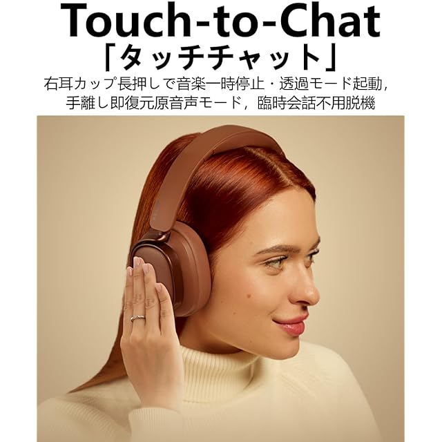 全天快適装着設計(265g 超軽量+高透気性メモリーフォーム): 約 265g の超軽量ボディにエルゴノミックヘッドバンドを採用し、圧迫感を最小限に抑える。肌に優しいレザーカバー付きメモリーフォーム耳カップは透気率 500g/m²/24h 以上を実現し、夏場でも長時間装着しても蒸れない。