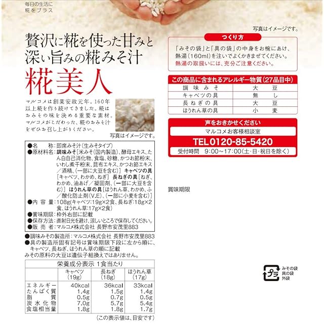 【原材料】調味みそ[米みそ、酵母エキス、たん白自己消化物、食塩、砂糖、かつお節粉末、いわし煮干粉末、かつお節エキス、昆布エキス、酒精] 具[キャベツ<キャベツ(キャベツ、ぶどう糖)、わかめ、ねぎ>、 長ねぎ<ねぎ、わかめ、油あげ、凝固剤>、 ほうれん草<ほうれん草、わかめ、ふ(小麦を含む)、ソルビトール、酸化防止剤(V.E)>]