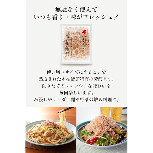 【トッピングやだしにも最適! 使い切りサイズの本枯鰹節削りぶし】熟練の技と伝統製法で丁寧に作られた、すっきりとした上品でまろやかな味と香りが特徴の鰹節専門店こだわりの国内製造の本枯鰹節を使用。口当たりソフトにトッピング向けの形状に削り上げました。ほうれん草のお浸しやオニオンサラダのトッピングがオススメ。