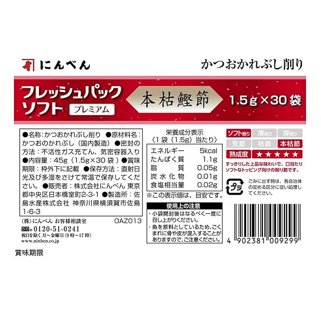 商品名:【.co.jp限定】にんべん フレッシュパックソフトプレミアム 本枯鰹節 1.5g×30袋(削り節 個包装)[大容量 ほんがれ かつお節] 1699年創業 鰹節・だし専門店のにんべん