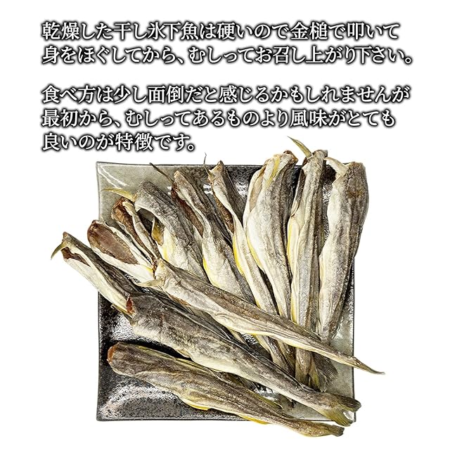 ✅乾燥した干し氷下魚は硬いのでトンカチで叩いて身をほぐしてから、むしってお召し上がり下さい。 食べ方は少し面倒だと感じるかもしれませんが最初から、むしってあるものより風味がとても良いのが特徴です。