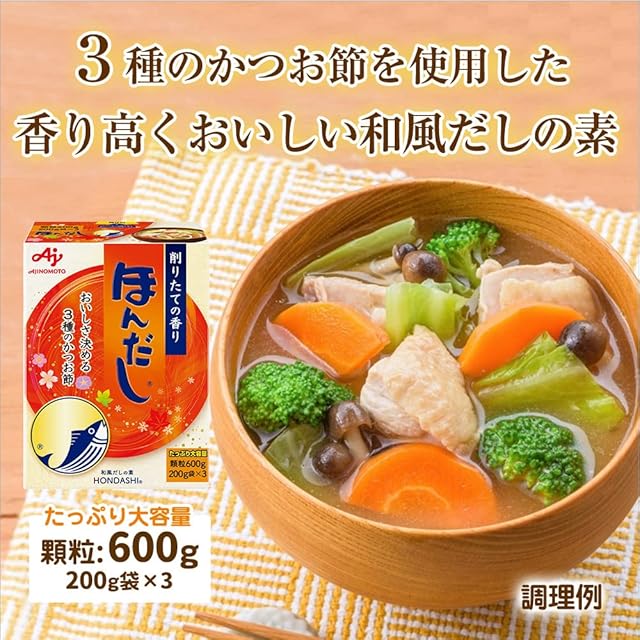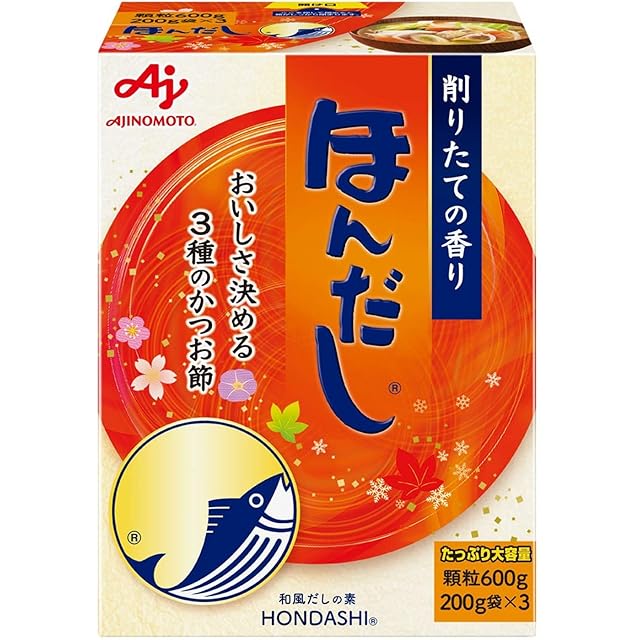 原材料:調味料(アミノ酸等)、食塩、砂糖類(砂糖、乳糖)、風味原料(かつおぶし粉末、かつおエキス)、酵母エキス、小麦たん白発酵調味料