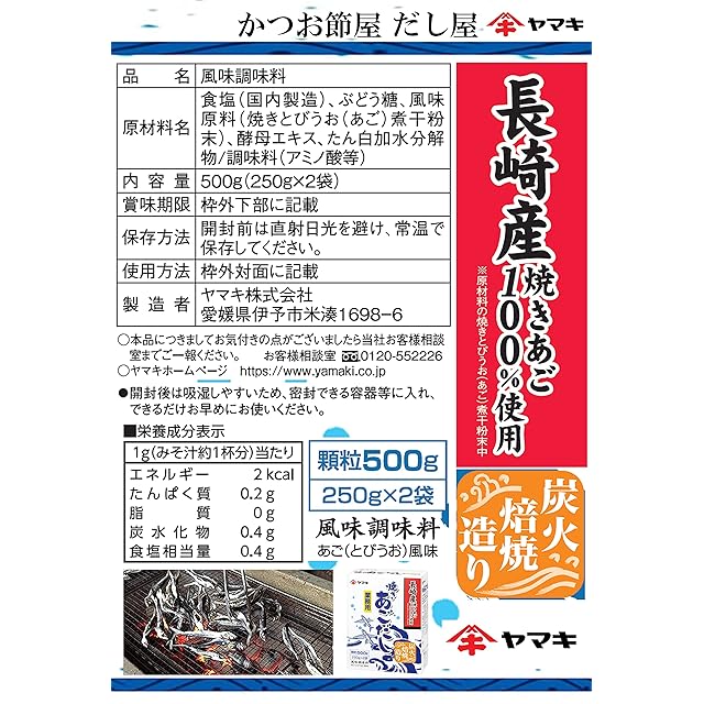 原材料:調味料(アミノ酸等)、食塩、ぶどう糖、風味原料(とびうお粉末)、酵母エキス、たん白加水分解物)