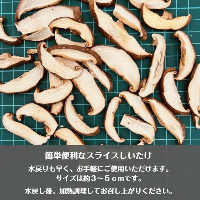 スライス加工した乾燥しいたけです。 水戻りが早く、簡単便利にご利用いただけます。 便利なチャック付き袋入り。しいたけを育てる栽培ブロック(菌床)の製造から、しいたけの採取、乾燥まで三重県内で一貫生産された、こだわりの純国産乾燥しいたけです。農薬は使用しておりません。