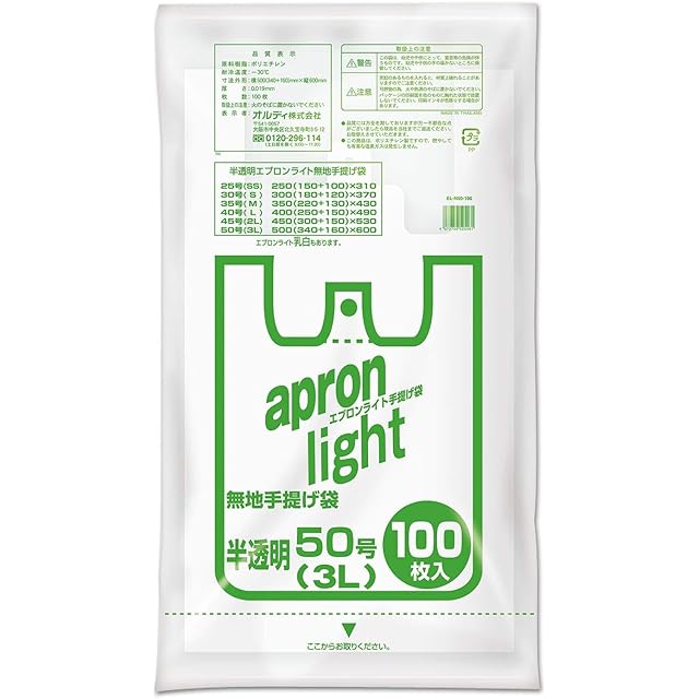 商品名:オルディ レジ袋 50号 3L 半透明 100枚入 コンビニ袋 テイクアウト 取っ手付き ポリ袋 手提げ袋 エプロンライト EL-N50-100