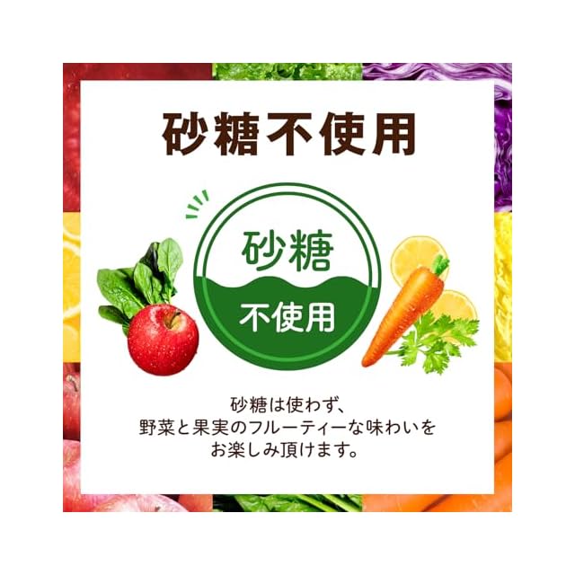 原材料:野菜(にんじん(輸入、国産)、ピーマン、かぼちゃ、とうもろこし、たまねぎ、メキャベツ(プチヴェール)、紫キャベツ、紫いも、だいこん、アスパラガス、ブロッコリー、キャベツ、クレソン、ビート、はくさい、ケール、ほうれん草、パセリ、レタス、セロリ)、果実(りんご、レモン、マンゴー、パッションフルーツ、バナナ、アセロラ)/ビタミンC、香料、クエン酸、ビタミンB2、ビタミンE、ビタミンB12