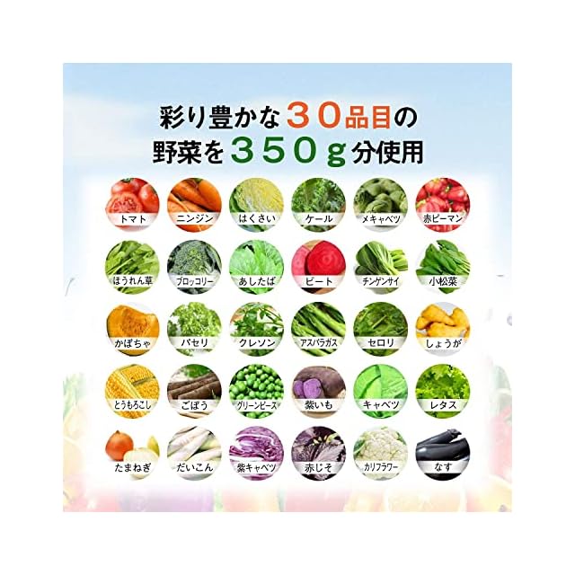 原材料:野菜(トマト、にんじん、はくさい、ケール、メキャベツ(プチヴェール)、赤ピーマン、ほうれん草、モロヘイヤ、ブロッコリー、レタス、セロリ、しょうが、紫キャベツ、赤じそ、よもぎ、チンゲンサイ、カリフラワー、クレソン、パセリ、かぼちゃ、アスパラガス、たまねぎ、ビート、だいこん、小松菜、紫いも、あしたば、なす、グリーンピース、ごぼう)、レモン果汁