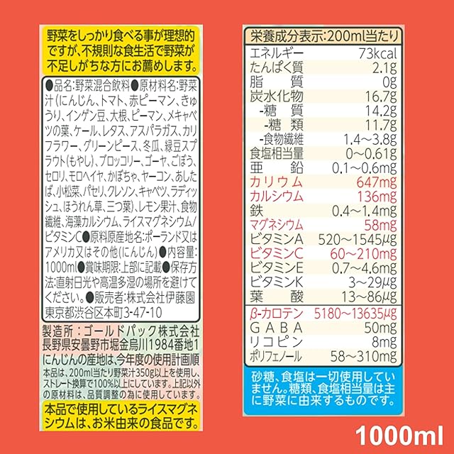 栄養成分(200ml当たり):エネルギー:73kcal、たんぱく質:2.1g、脂質:0g、炭水化物:16.7g(糖質:14.2g (糖類:11.7g)、食物繊維:1.4~3.8g)、食塩相当量:0~0.61g、亜鉛:0.1~0.6mg、カリウム:647mg、カルシウム:136mg、鉄:0.4~1.4mg、マグネシウム:58mg、ビタミンA:520~1545μg、ビタミンC:60~210mg、ビタミンE 0.7~4.6mg、ビタミンK:3~29μg、葉酸:13~86μg、β-カロテン:5180~13635μg、GABA:50mg、リコピン:8mg、ポリフェノール:58~310mg