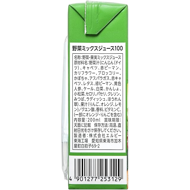 原材料:野菜汁(にんじん(ドイツ)、キャベツ、赤ピーマン、カリフラワー、ブロッコリー、かぼちゃ、アスパラガス、赤キャベツ、レタス、緑ピーマン、黄色人参、ケール、白菜、かんしょ、小松菜、セロリ、パセリ、クレソン、みつば、ラディッシュ、ほうれん草)、果汁(りんご、オレンジ、レモン)/クエン酸、香料、ビタミンC、(一部にオレンジ・りんごを含む)